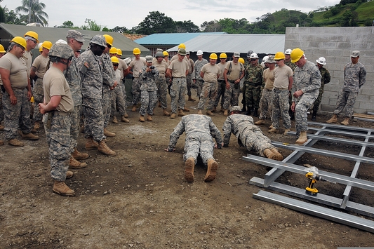 | U.S. Army Maj. Gen. David J. Conboy, center left, the commanding general of the 416th Theater Engineer Command, challenges Spc. Evan McEntee, with the 409th Engineering Company, to a pushup contest during Beyond the Horizon (BTH) 2013 in Achiote, Panama, May 21, 2013. BTH is a Chairman of the Joint Chiefs of Staff-directed, U.S. Southern Command-sponsored joint and combined field training humanitarian exercise in which troops specializing in engineering, construction and health care provide much-needed services to communities in need while receiving valuable deployment training and building important relationships with partner nations. |